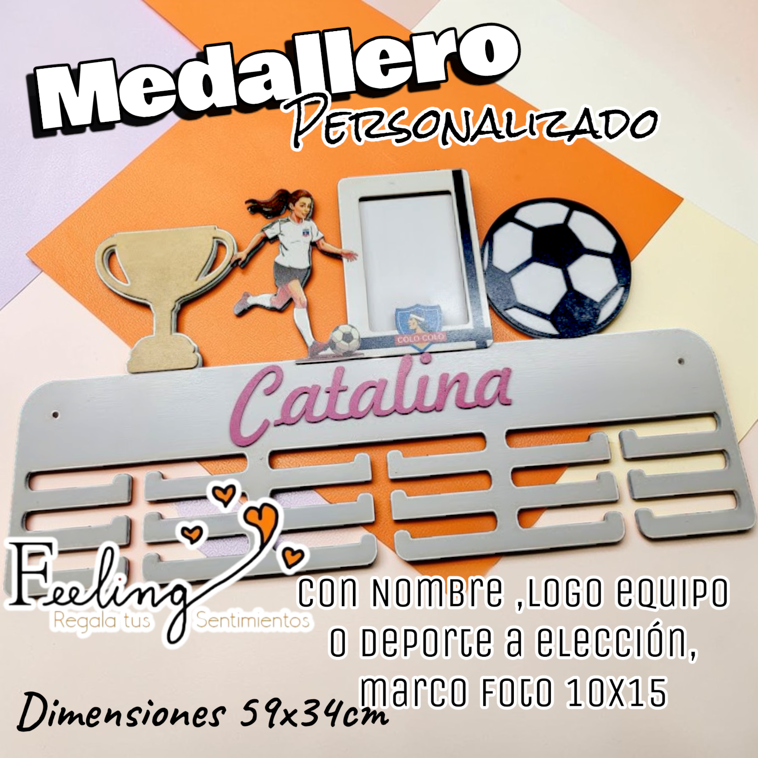 Fabricado en MDF de 5mm con aplicaciones en 3mm , incluye pintado y decorado según colores del equipo deportivo  o deporte seleccionado, con capacidad mínima de 18 medallas, con marco de foto de 10×15 cm, decoraciones y nombre pintado en colores a juego. dimensiones 59x34cm.