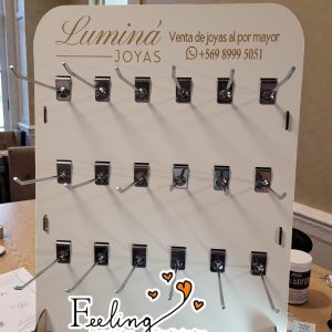 Posee 3 mostradores de 17cm de ancho x 25cm de alto cada uno con un escalonado que permite mostrar hasta 6 collares cada uno ( 18 collares en total)